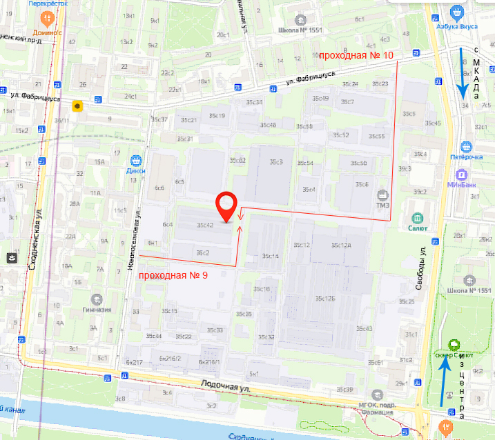 к проходной №10 - съезд с улицы Свободы на улицу Фабрициуса, на перекрестке налево;